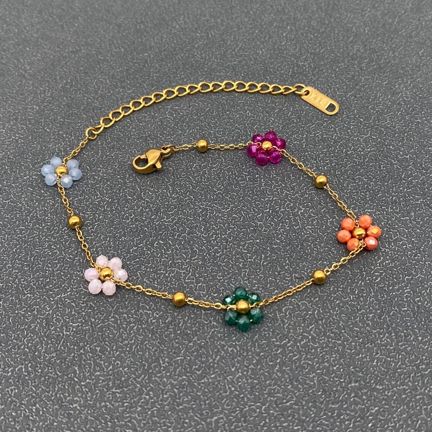 5 Color Glass Beaded Flowers 18K Gold Plated SS Bracelet -FGS