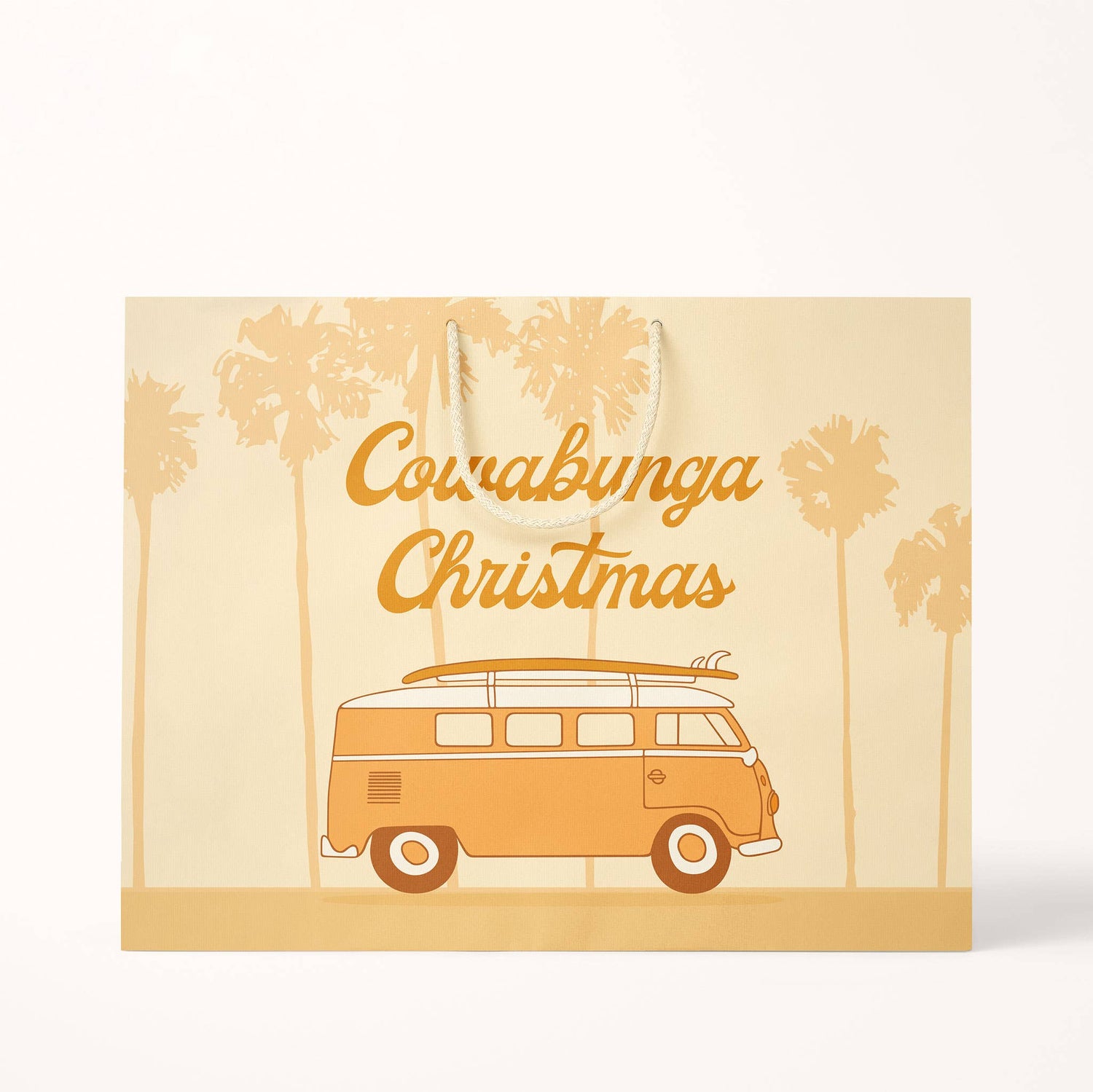 Add a special touch to your gifts this season with our Cowabunga Christmas Gift Bag, inspired by our love for vintage California beach culture. Our paper gift bags are made of FSC certified sustainably sourced paper, and feature cotton handles. . Made with FSC certified paper . Cotton handles . Large | 13" x 10" x 5.25" . Disclaimer: Images are digital renderings, physical product may vary in color from the images. . Imported