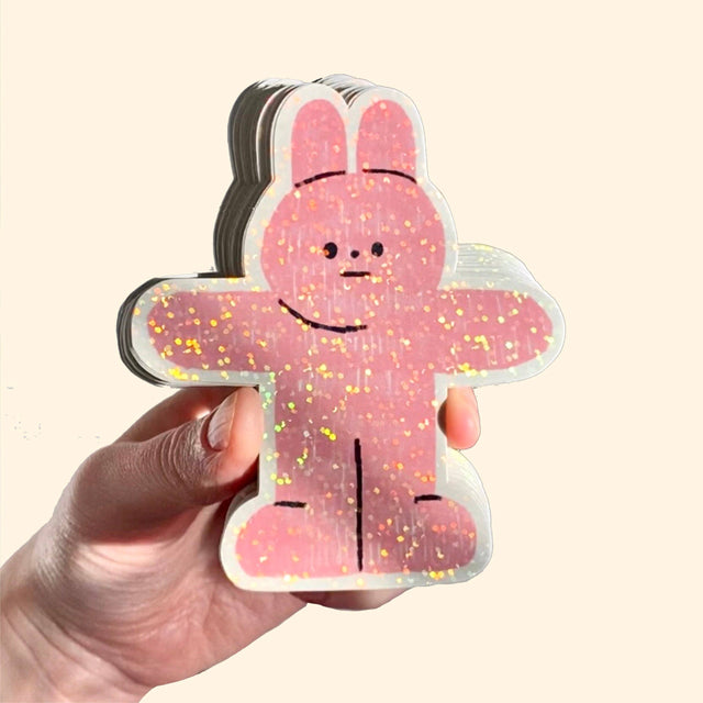 Durable rainbow glitter sticker vinyl sticker featuring a T-posing pink rabbit. Sticker measures 10 x 8.5cm