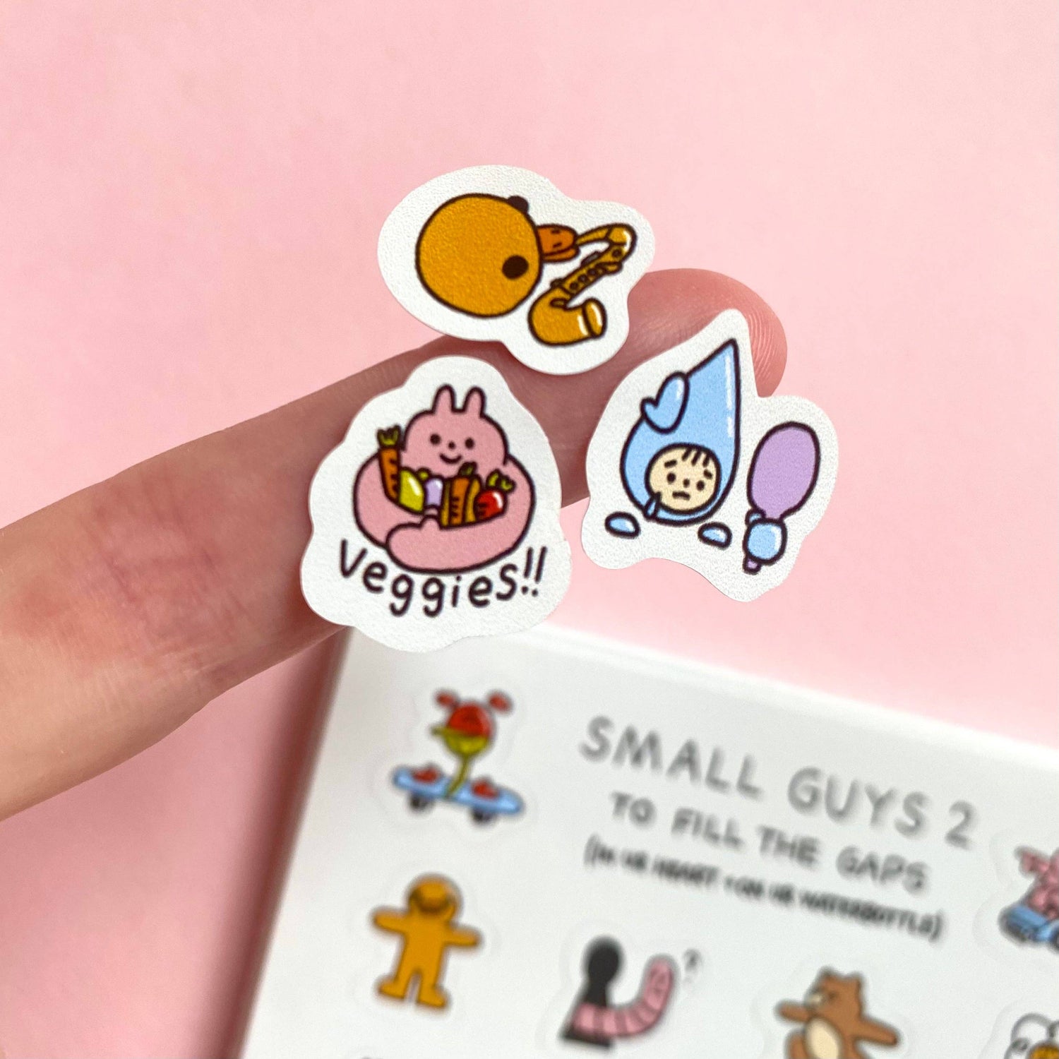 A sticker sheet featuring 26 durable vinyl stickers of small guys to fill the gaps (in ur heart and on ur waterbottle) For the original Small Guys 1 sticker sheet go here.