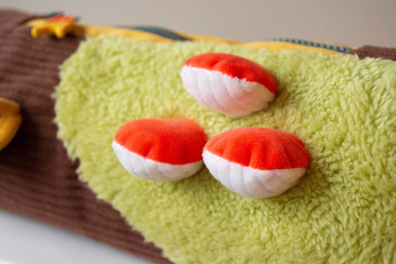 Crafted with chocolate brown corduroy bark, soft chartreuse sherpa moss, mustard yellow canvas, printed wood-patterned canvas liner, and super soft and squishy mochi minky fabric mushrooms. Each bag comes with a PVC banana slug zipper pull.