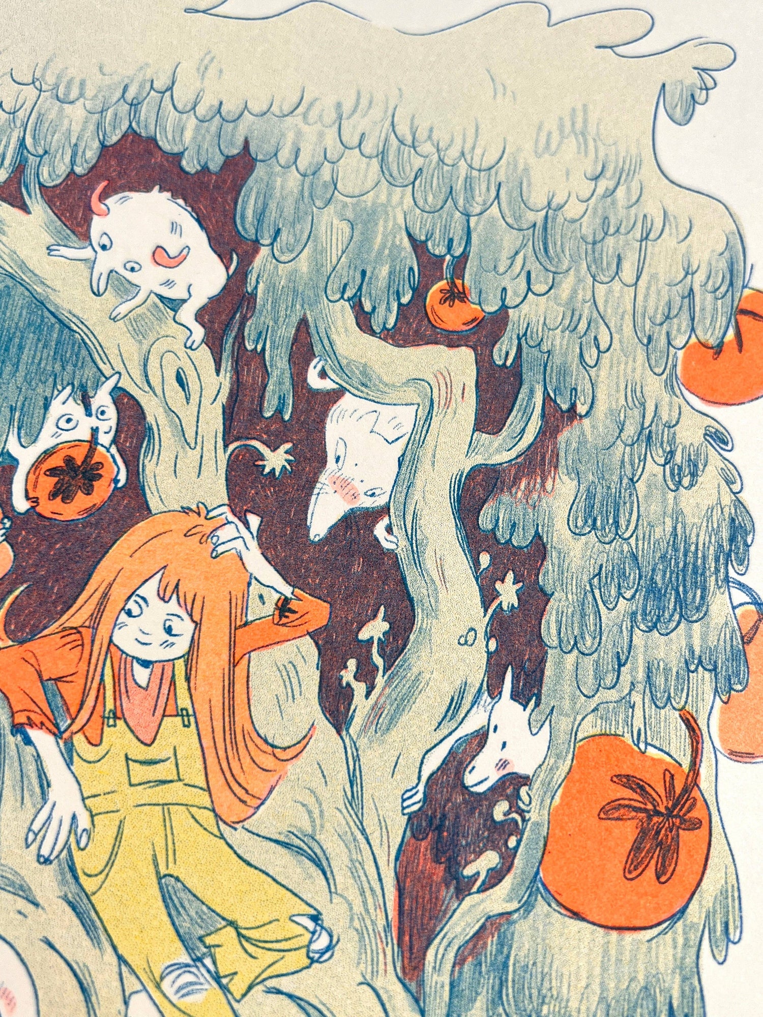 New version of an older print in different colors and larger. This is a three color Risograph print, made by layering blue, fluorescent orange and yellow pink ink. Hand printed by Natalie in her Los Angeles studio. Size is 11 x 17" on smooth 65lb. natural white paper. *Riso or Risograph is a printing process made by layering different colored inks to create rich and vibrant images. Because this process requires adding one layer of ink at a time, slight differences in registration are natural and sometimes roller marks from the machine can occur. This is just a quirk of working on the Riso that makes each print unique! I always inspect each Riso print for good print registration and send them with care in a stay-flat mailer. I currently ship out once per week, please allow for 1-2 weeks shipping time. Thank you! All prints are shipped in a cellophane sleeve and a stay-flat mailer.
