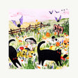 The original drawing was made with watercolor and marker on petal paper. Features two big kitties playing out in the field, and the bats are coming to see what they're up to!