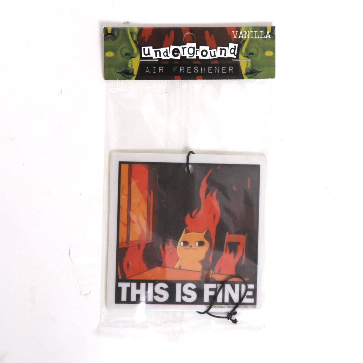Cats don't care if their world is on fire. This is fine. Everything is fine. This air freshener comes packaged in a heat-sealed poly bag to lock in that refreshing vanilla fragrance until ready for use.
