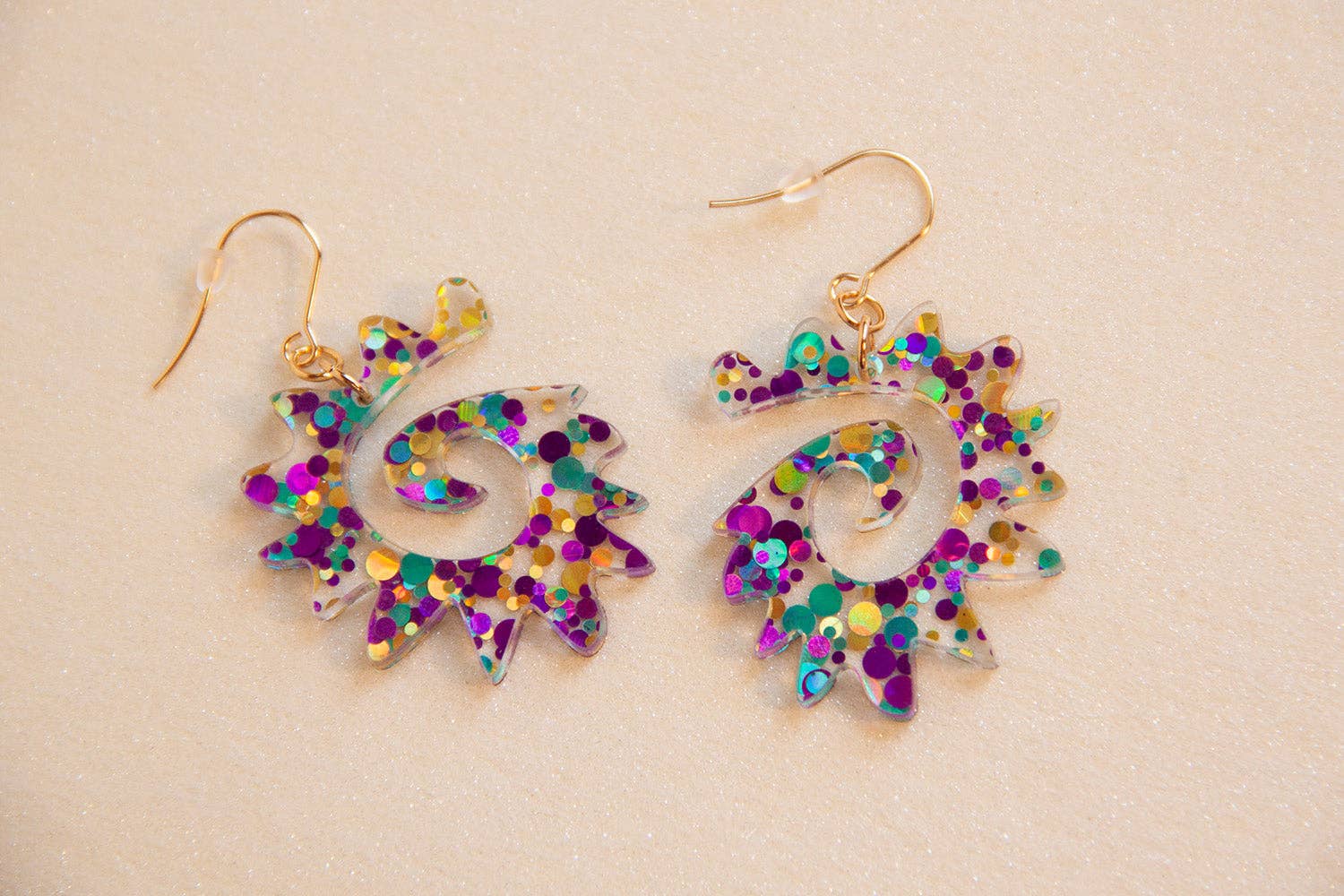 The Caracol earrings are inspired by thinking of the inside of a sea shell. This shape first originated for my mobiles collection and it's now available in jewelry format. It is a playful shape that came from looking at Mayan symbolisms, the shell is usually a representation of the god Quetzacoatl. These earrings are a limited edition and they're made with a polka dot glitter acrylic and a plated gold hook. measures 0.125" by 1" by 1."