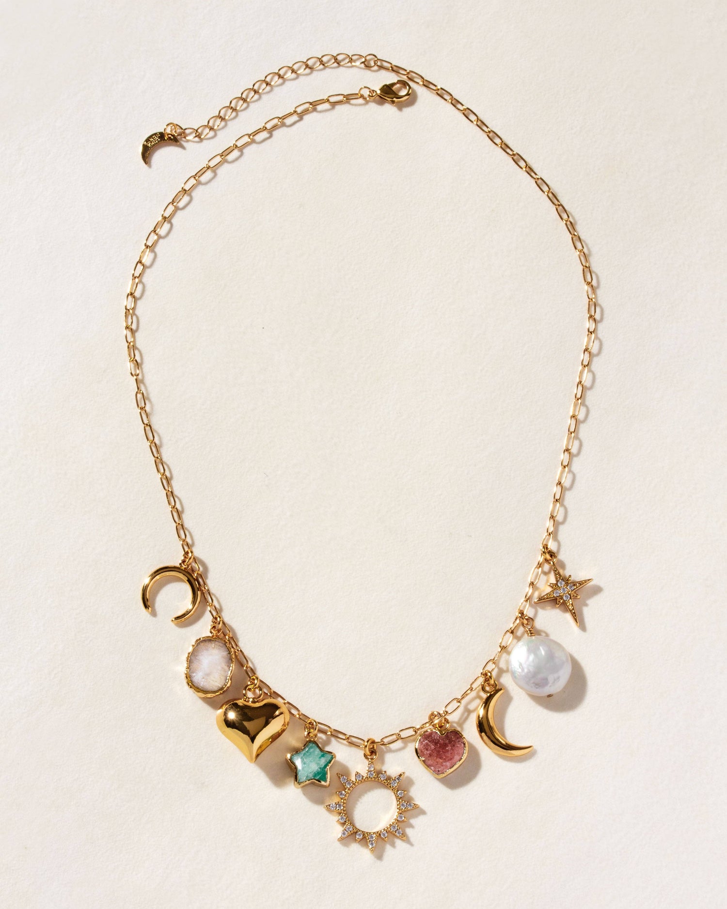 Curate a collection that stands out with a piece that blends bohemian charm, playful color, and cosmic allure. Featuring a glowing rainbow moonstone, a faceted amazonite star, a soft strawberry quartz heart, and a luminous coin pearl, this necklace offers a dreamy balance of whimsy and femininity.