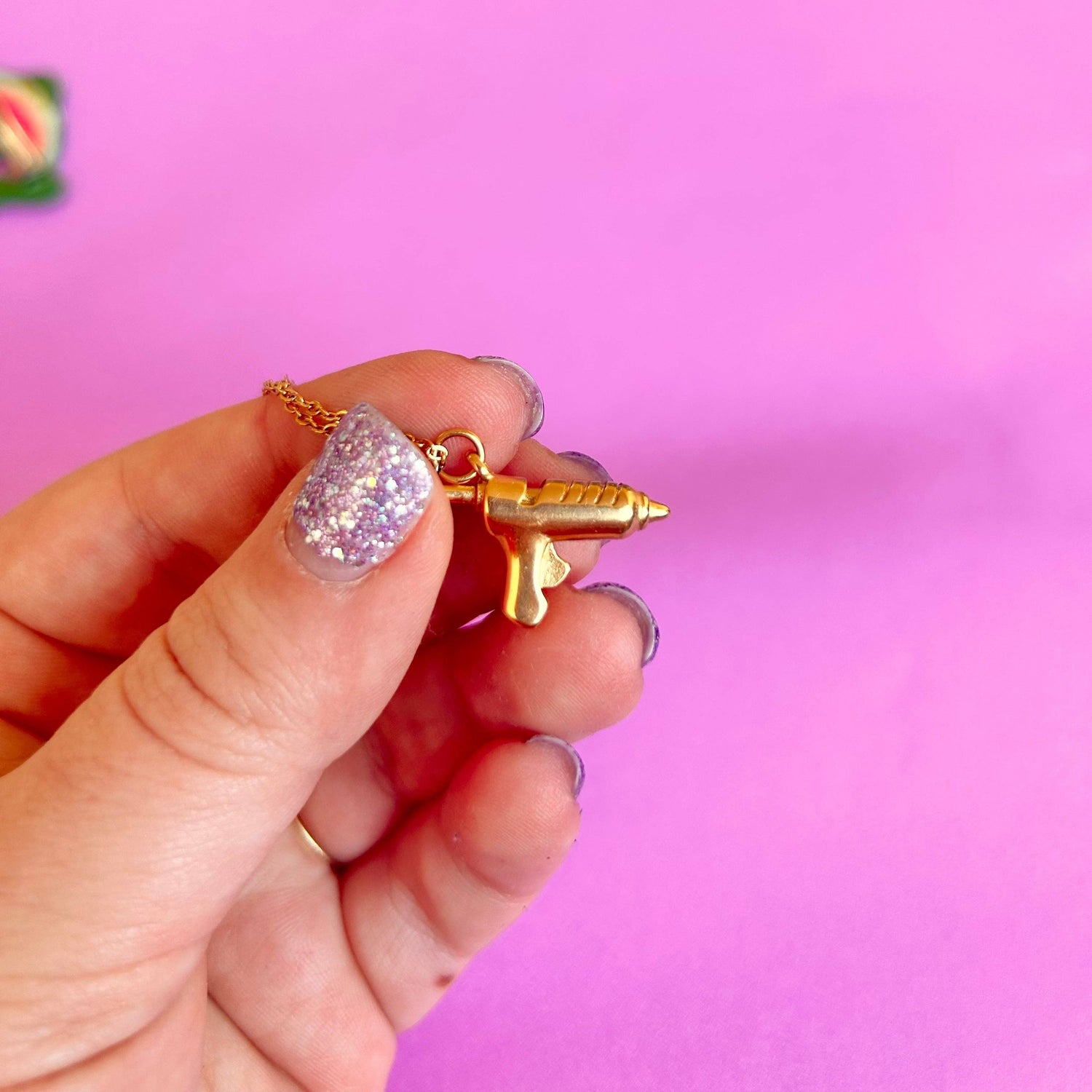 Necklace measures 15.5-17.5 inches and features a stainless steel chain with 18k gold plating and a 3d hot glue gun designed by me!