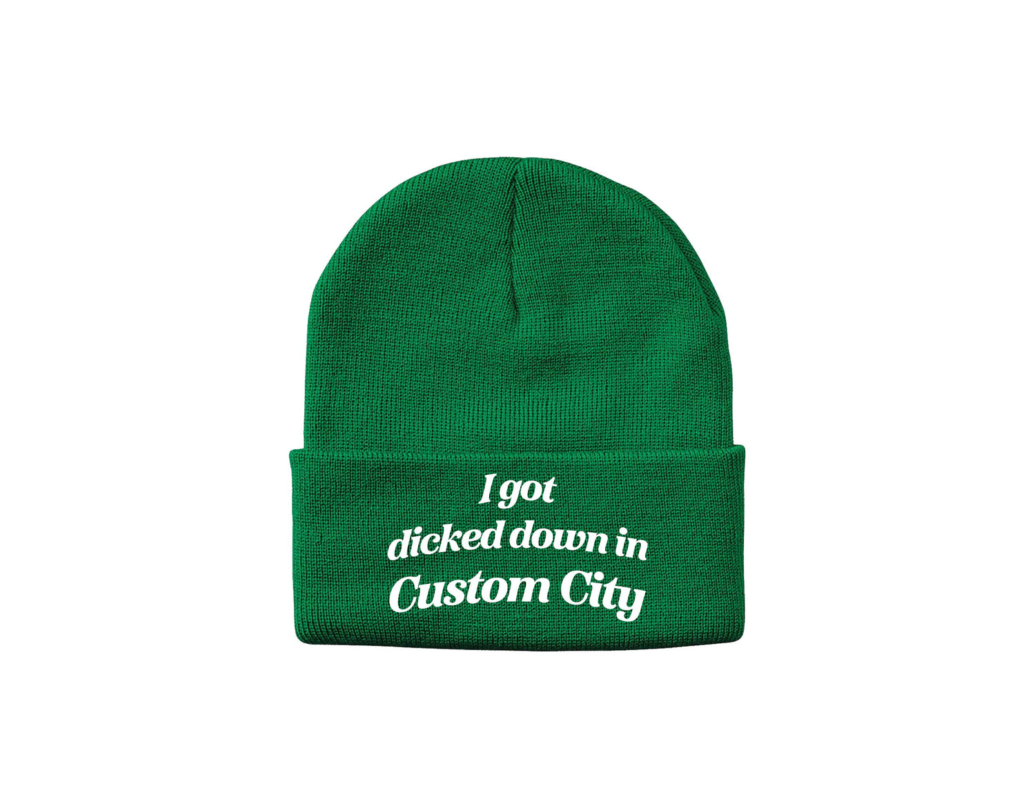 I Got Dicked Down in Kansas City - Embroidered Winter Beanie Customize this popular beanie with your city, town or state name! 100% acrylic.