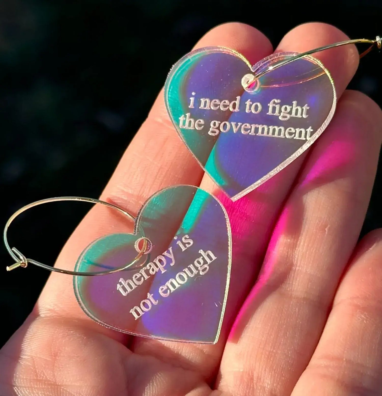 These are dazzling earrings made with iridescent acrylic. The iridescent is color-shifting and a bit translucent. They are not solely blue despite the way they look in photos sometimes. The size of the heart charm is: 1.1 x 1.2 inches, which is a little bigger than a quarter. These are made and designed by Jenny Shlemon. These earrings come on a medium sized surgical steel hoop that comes in gold or steel. The hoops are nickel free and great for sensitive ears.