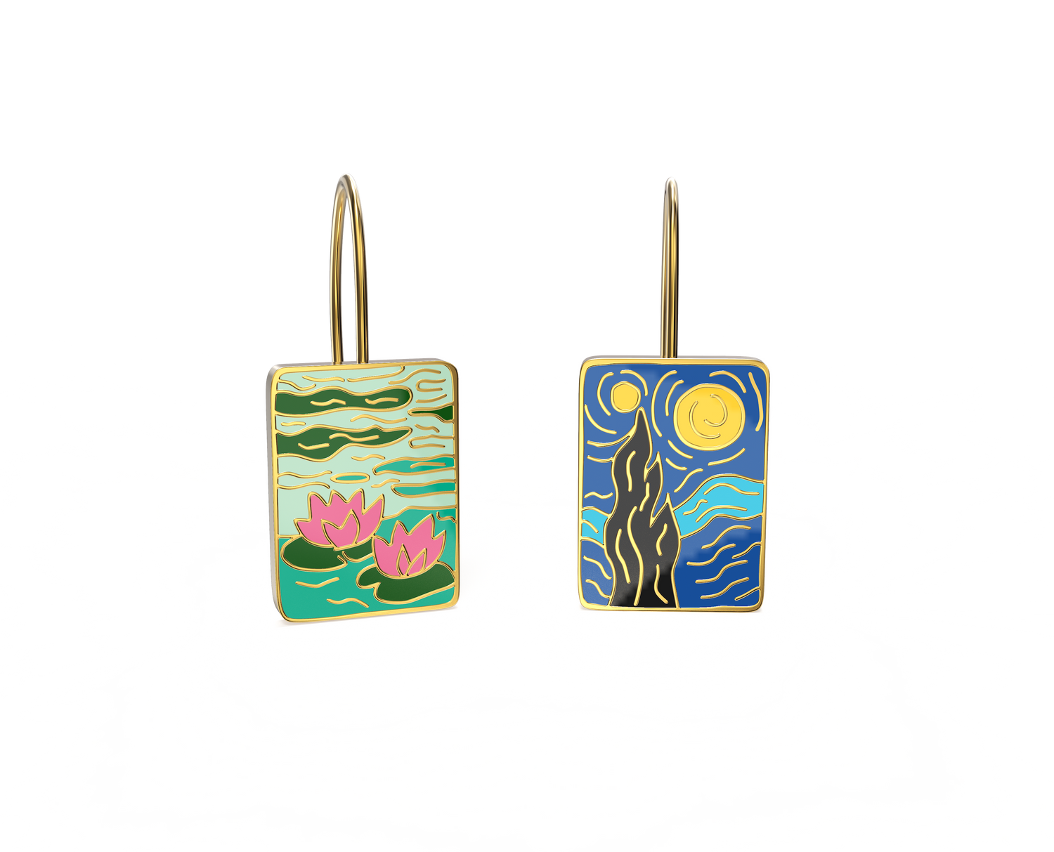 A nod to two masters of color. This enamel pair draws from the palettes of Monet and Van Gogh, soft brushstrokes, bold hues, and layered textures that give a painterly feel in a wearable form. A standout for art museums, gift shops, and anyone who loves color with a story. Presented in a matchbook-style gold foil box, our signature mismatched earrings feature 18k gold-gilt enamel on hanging earwires.
