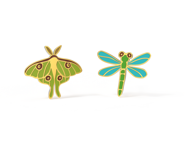 A bright pairing of two natural standouts. This enamel set features a luna moth and a dragonfly. A solid pick for garden shops, gift stores, and nature lovers of all kinds. Presented in our original glass vial packaging, the mismatched yet perfectly paired cloisonné petite studs are gilded in 22-karat gold and have hypoallergenic posts. Each earring is 0.5" (1.3 cm) or slightly smaller.
