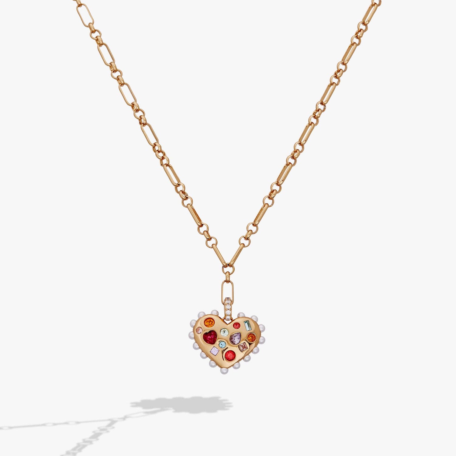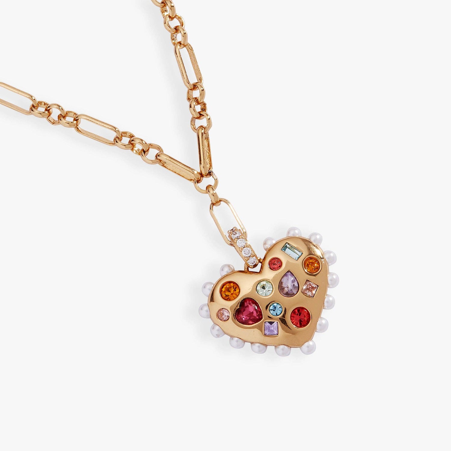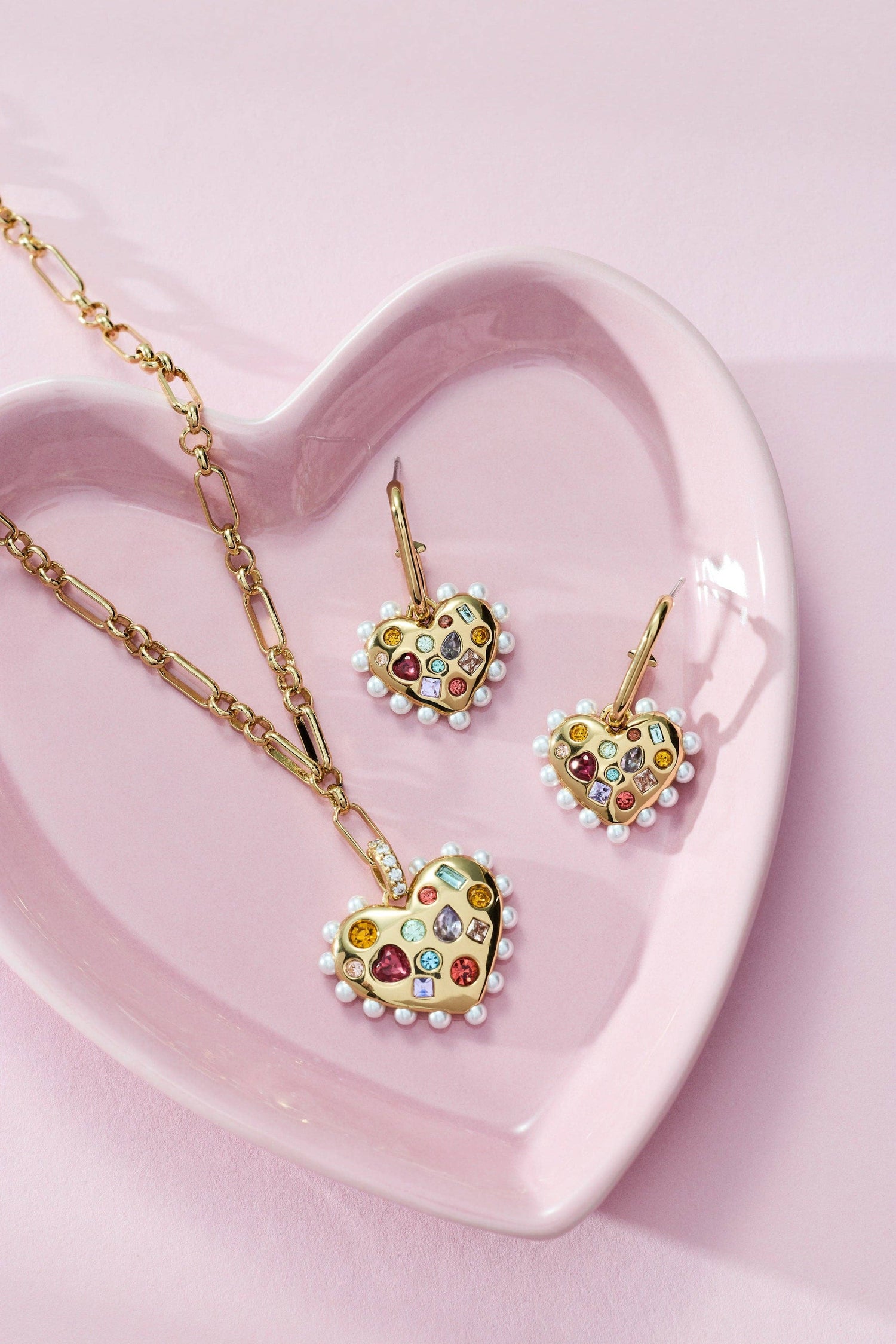 Let your heart shine bright with this delightful pendant necklace! Sparkling rainbow stones dance across a charming heart charm, framed by a lustrous pearl border that adds timeless elegance. Flip it over to reveal our iconic etched star logo on the back. A playful way to celebrate love, joy, and all the colorful moments that make life magical.