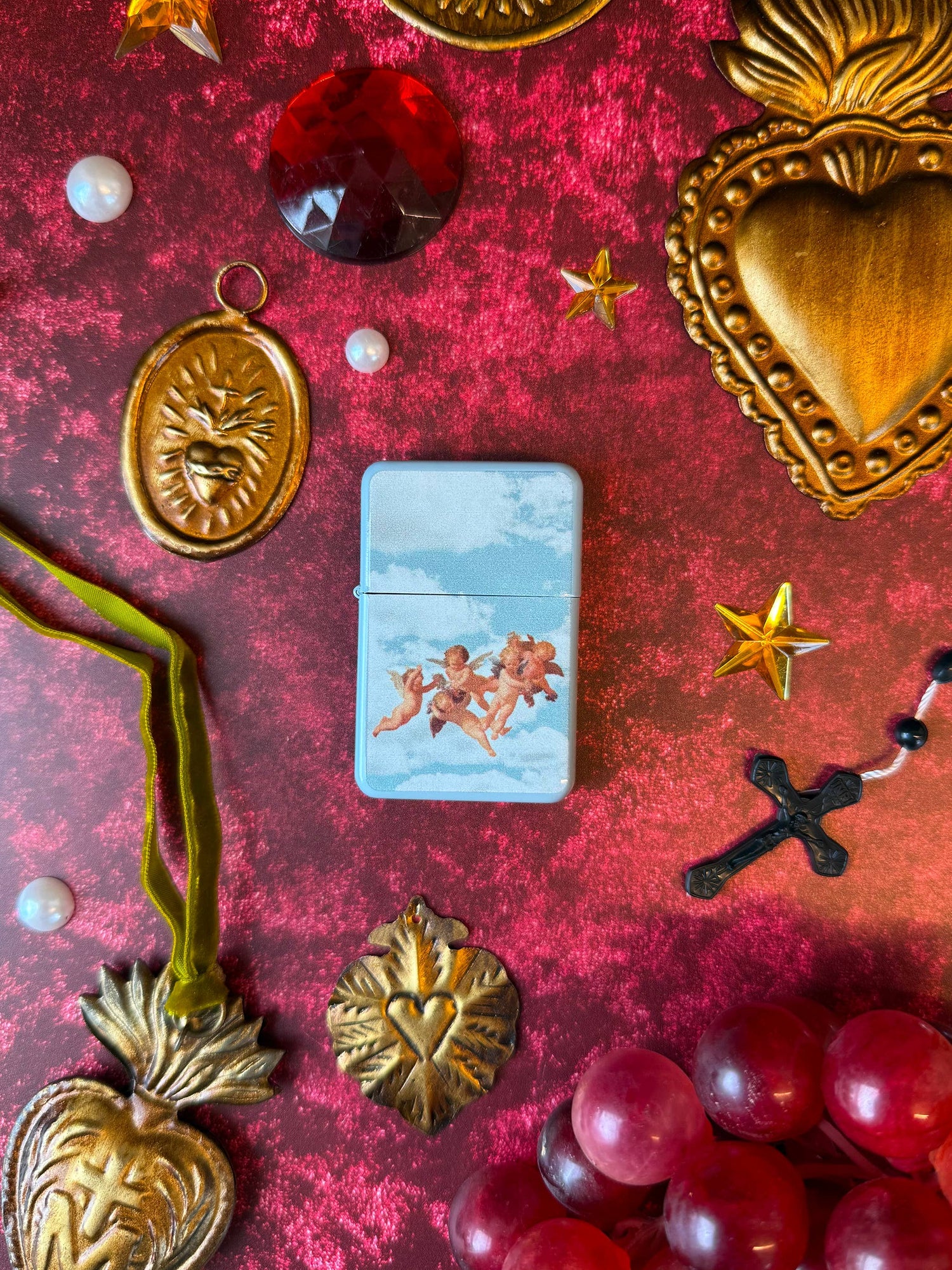 This lighter fell straight from heaven! This light blue lighter features cute little cherubs whimsically flying in the sky.