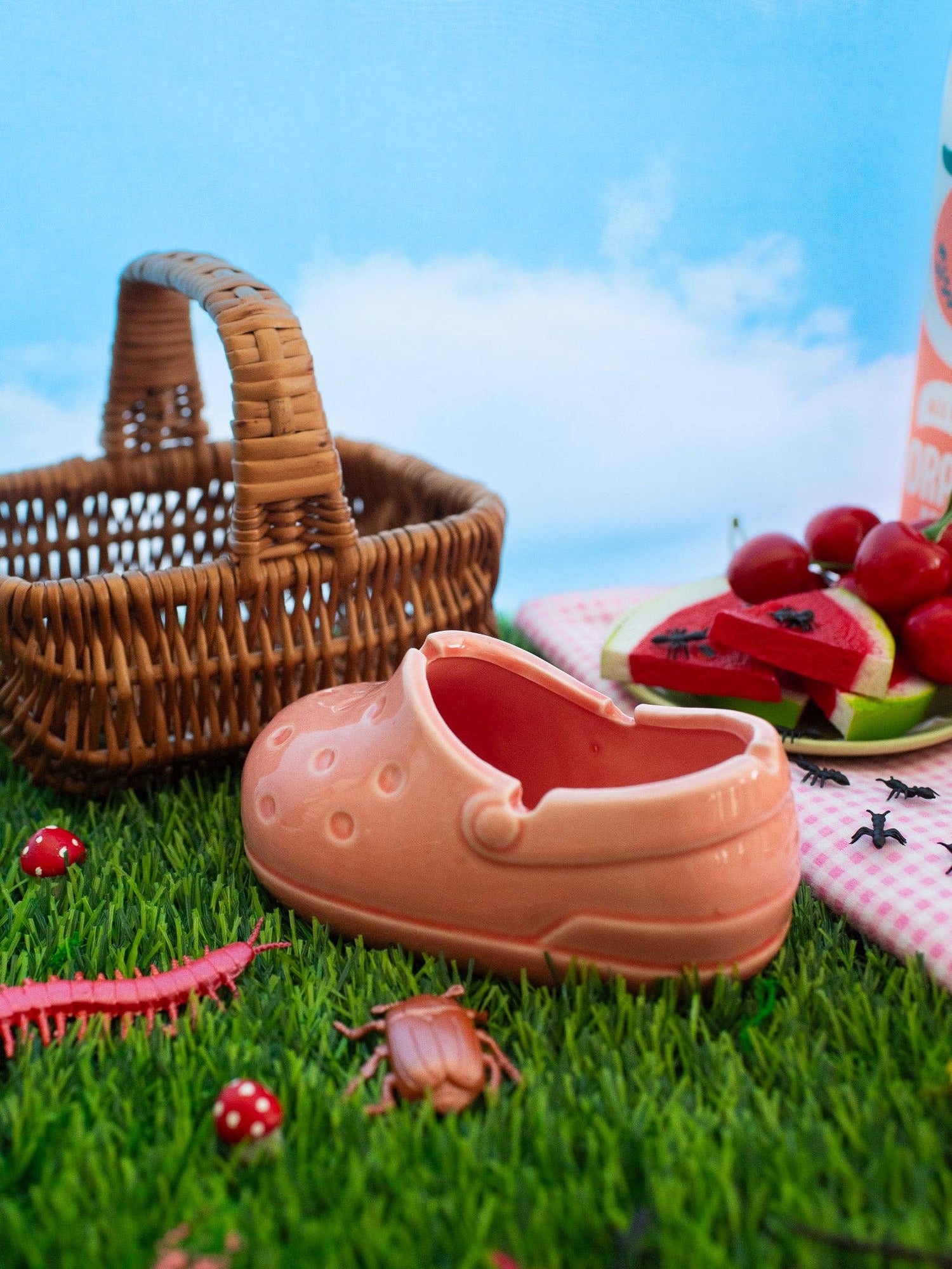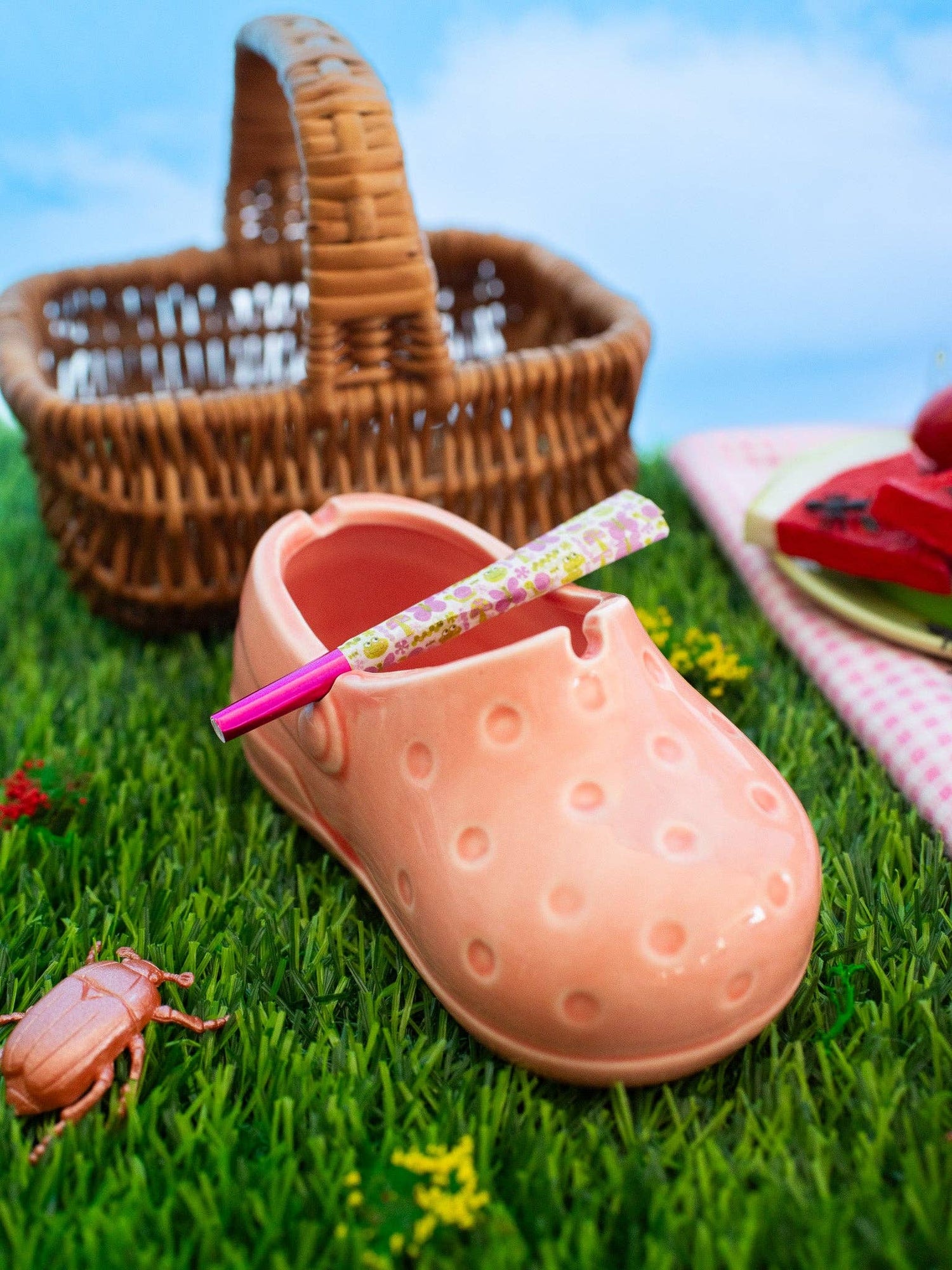 This ash tray is made of pink ceramic and is designed to look like your fav garden shoe.