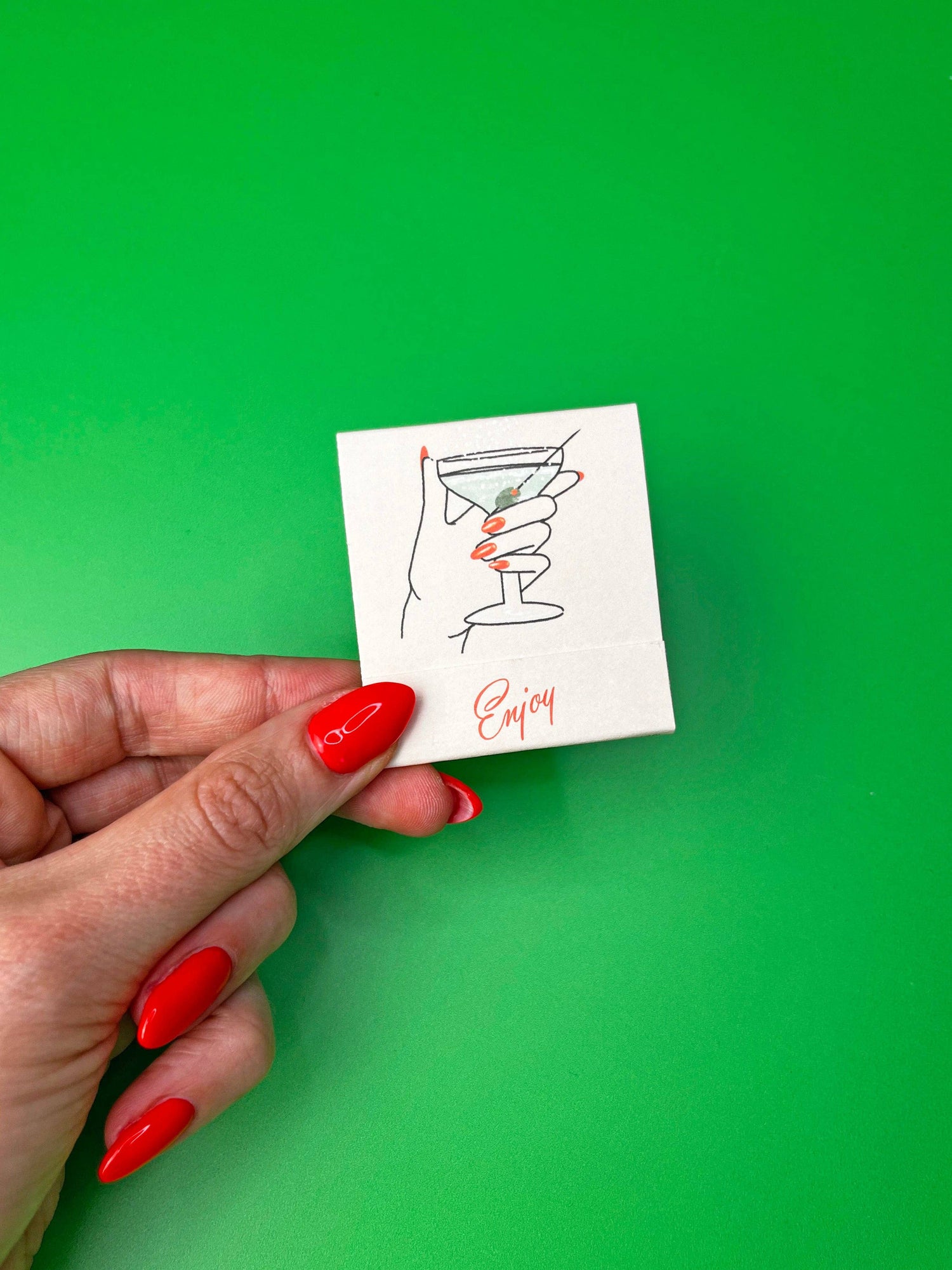 Our newest matches, designed by us!! This matchbook features everyone's favorite cocktail- a (dirty) martini! The art is done by meeeee! The inside of the matchbook has the recipe for the cocktail and each match features a different ingredient of that cocktail cause we cute like that.
