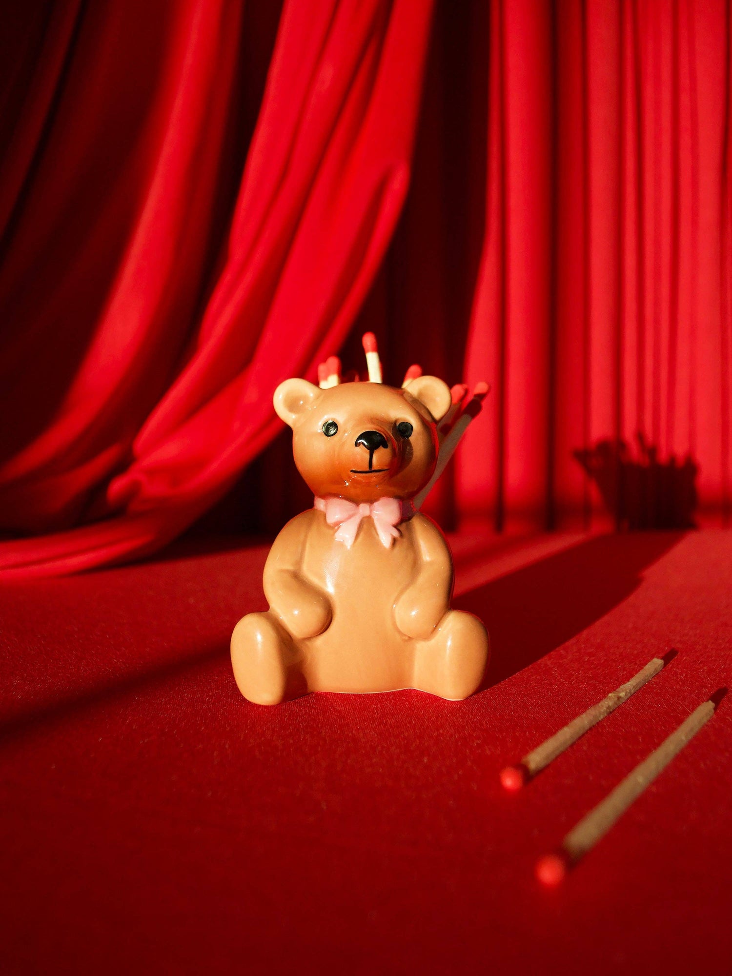 This match striker is bear-y cute, and functional too! This striker is shaped like the cutest little bear you've ever seen! Comes with 25 matches measuring 3.75" each, stored conveniently inside the bear! When you need a light, tilt it over and strike a match on the base! Looks great on a desk, coffee table, shelf, etc! Also makes a cute tiny vase for tiny flowers :)
