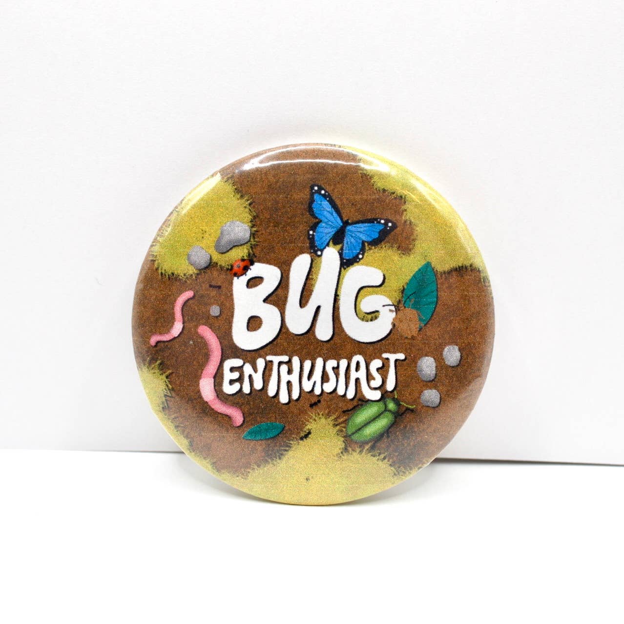 Show off your personality with this cute handmade button. This button has a plastic backing with a steel pin. The hand drawn design features some colorful bugs. In the middle it says "Bug Enthusiast". Its perfect for the insect lover in your life.