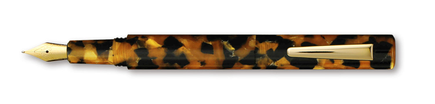 Each pattern is unique yet toned down into three sophisticated hues, with a contrasting 24k gold plated clip and nib. Ink flows smoothly from the pen’s fine tip. Compact yet perfect size when the cap is attached to its barrel for writing, providing a firm grip just above the nib.