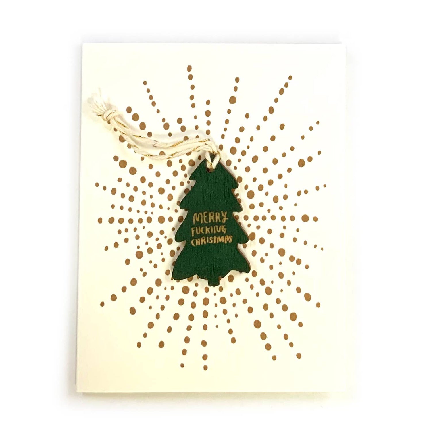 Gorgeous letterpress card (gold ink on creamy paper) topped with an adorable little tree-shaped ornament, engraved with the words “MERRY FUCKING CHRISTMAS.