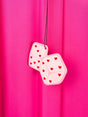 Measures 4" x 3" and is double-sided. Design is a pink and red dice.