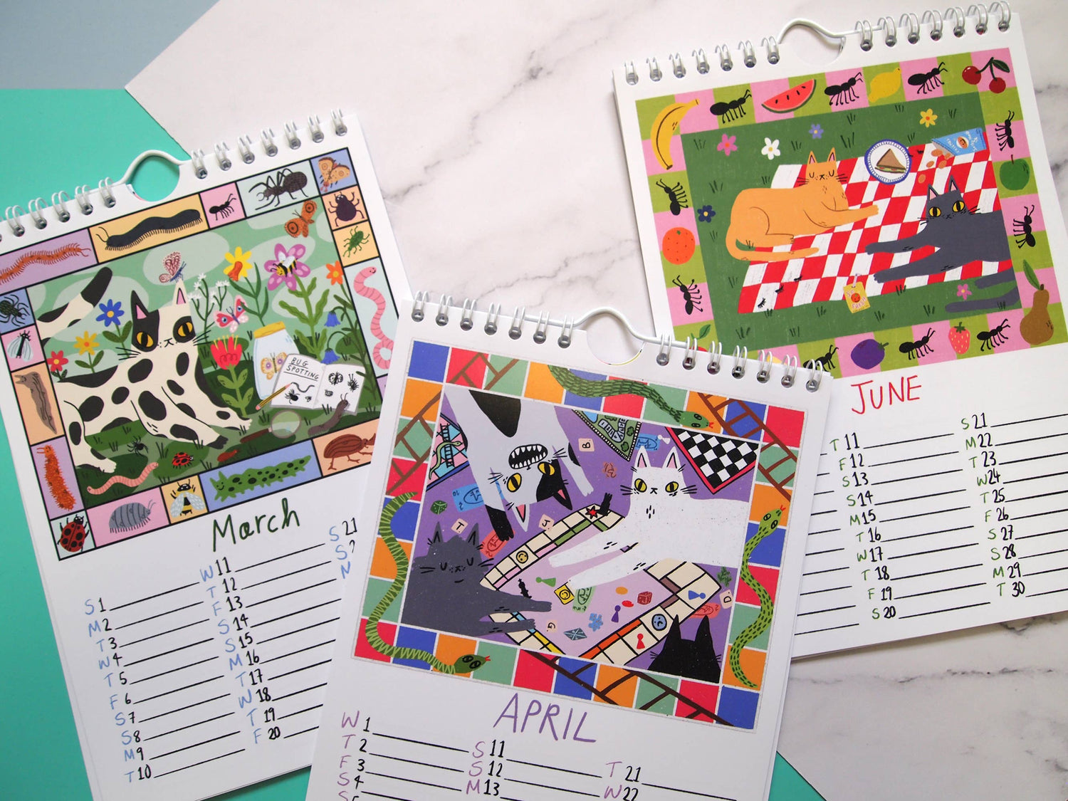 Get ready for the year ahead with this calendar, filled with bright and fun cat illustrations. Each month has a different theme - some are seasonal, some are just for fun. Decorative frames for each month tie it all together, and I had so much fun deciding on what to draw. I love how the calendar looks hung on the wall, filling every space with cats! Each month is illustrated in a different style which means you get to switch it up every 4 weeks!