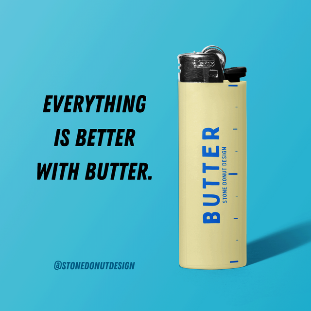 The older I get the more I realize the old adage is true - everything IS better with butter. Child-resistant, J24 Maxi pocket lighter, wrapped with vinyl featuring Stone Donut Design artwork. Vinyl wrap designed, produced and applied here in our Maine studio. :)