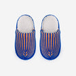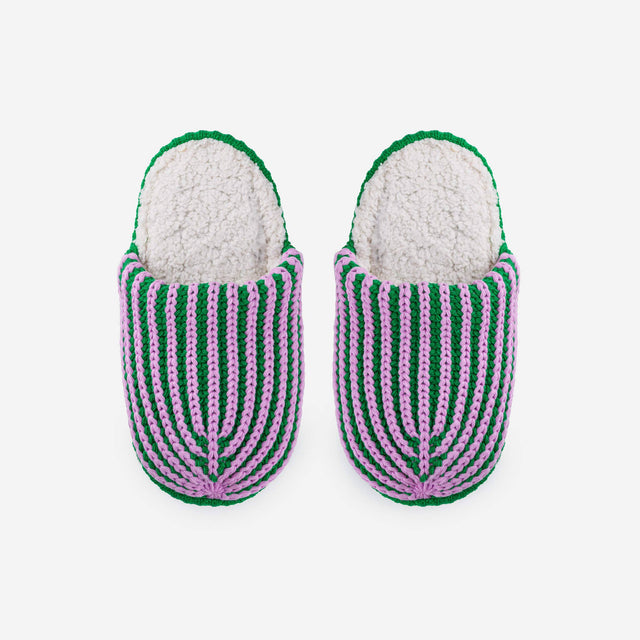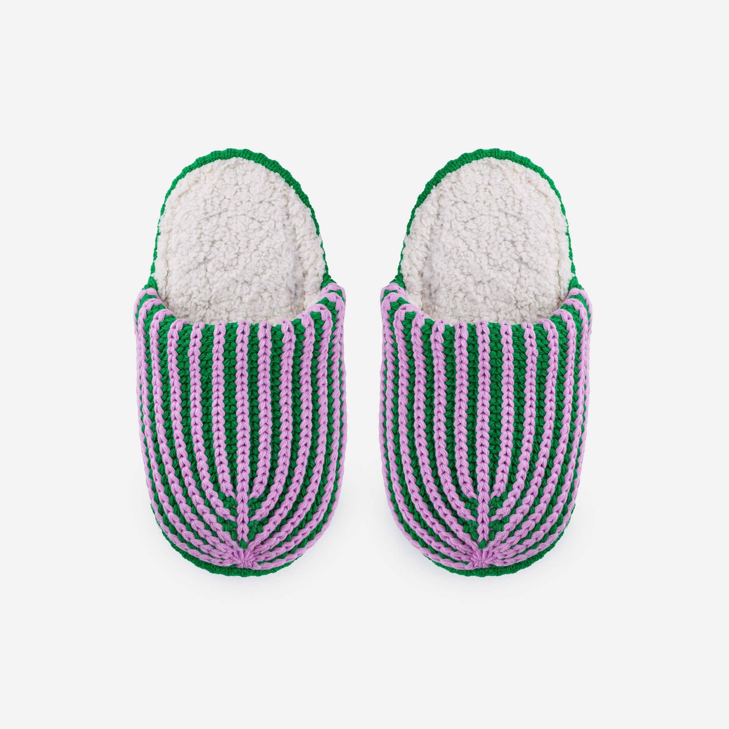 A plush, colorful take on your favorite spa-style house slippers. Backless slide slippers knit with a two-tone chunky rib stripe pattern. Fully fleece-lined with slip-resistant padded soles.