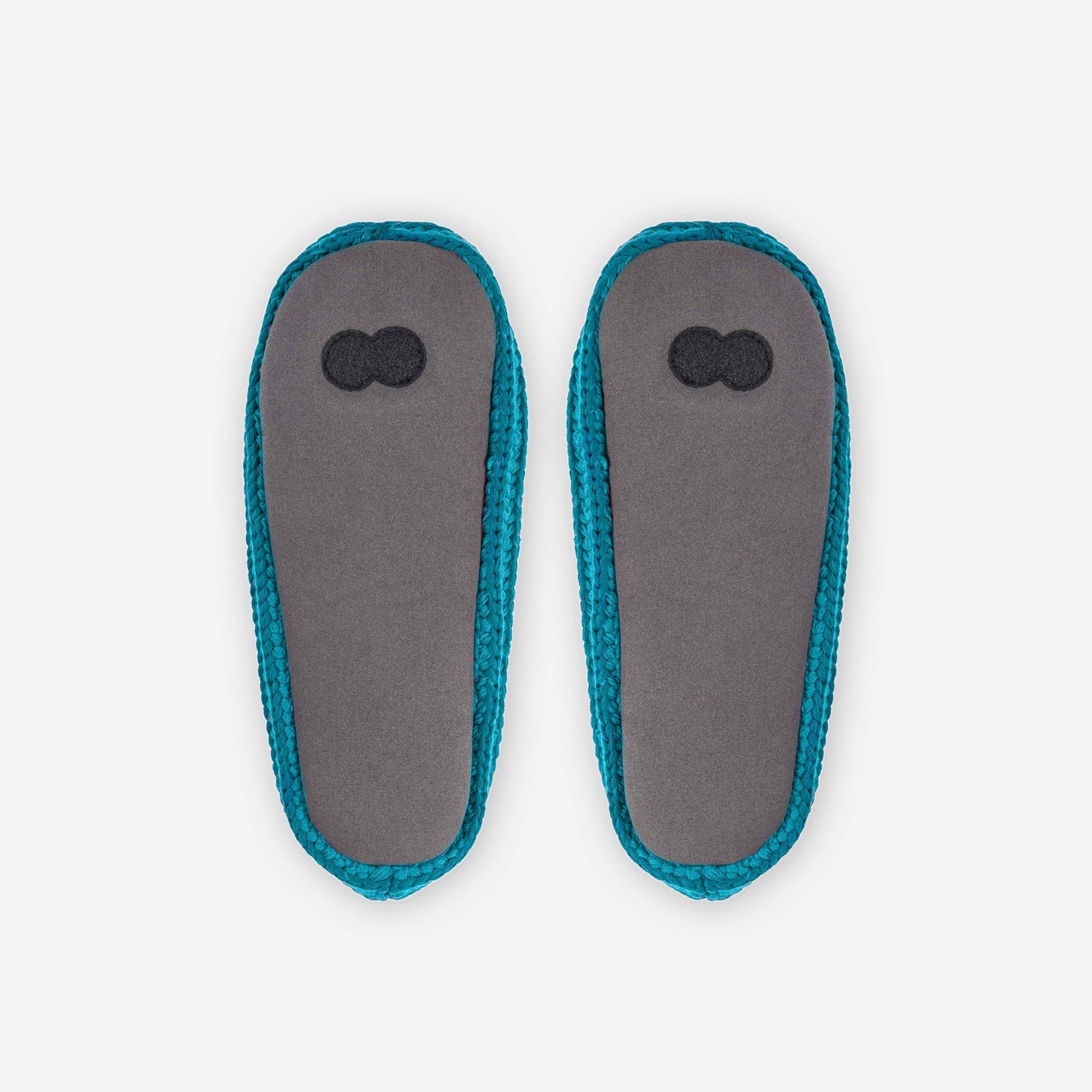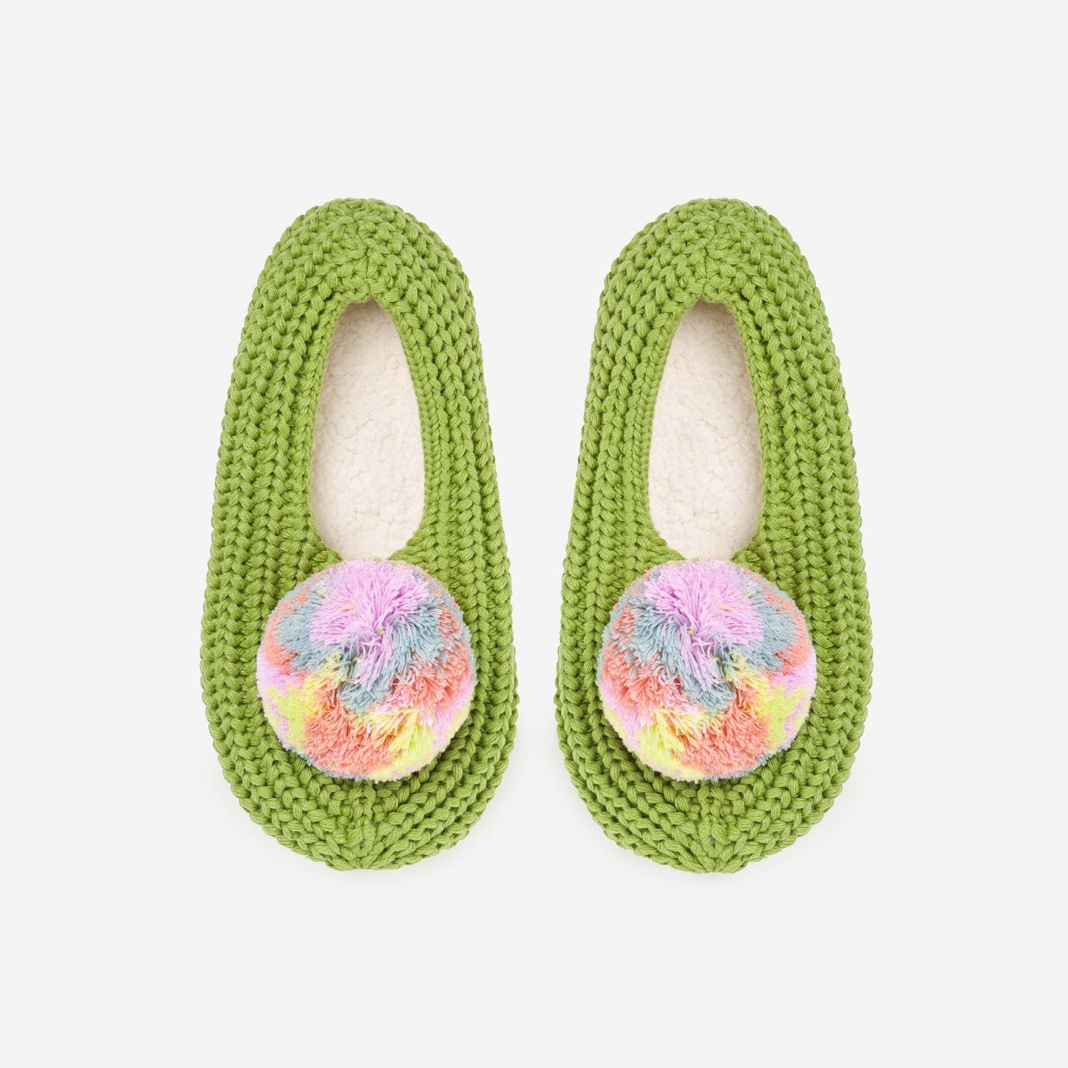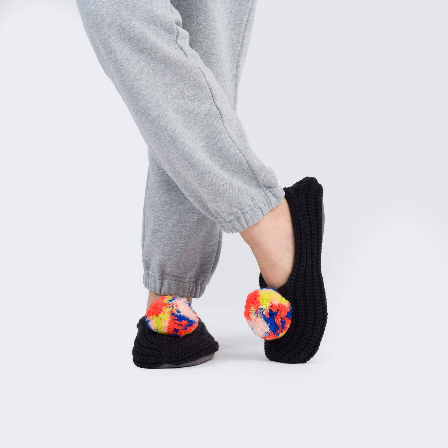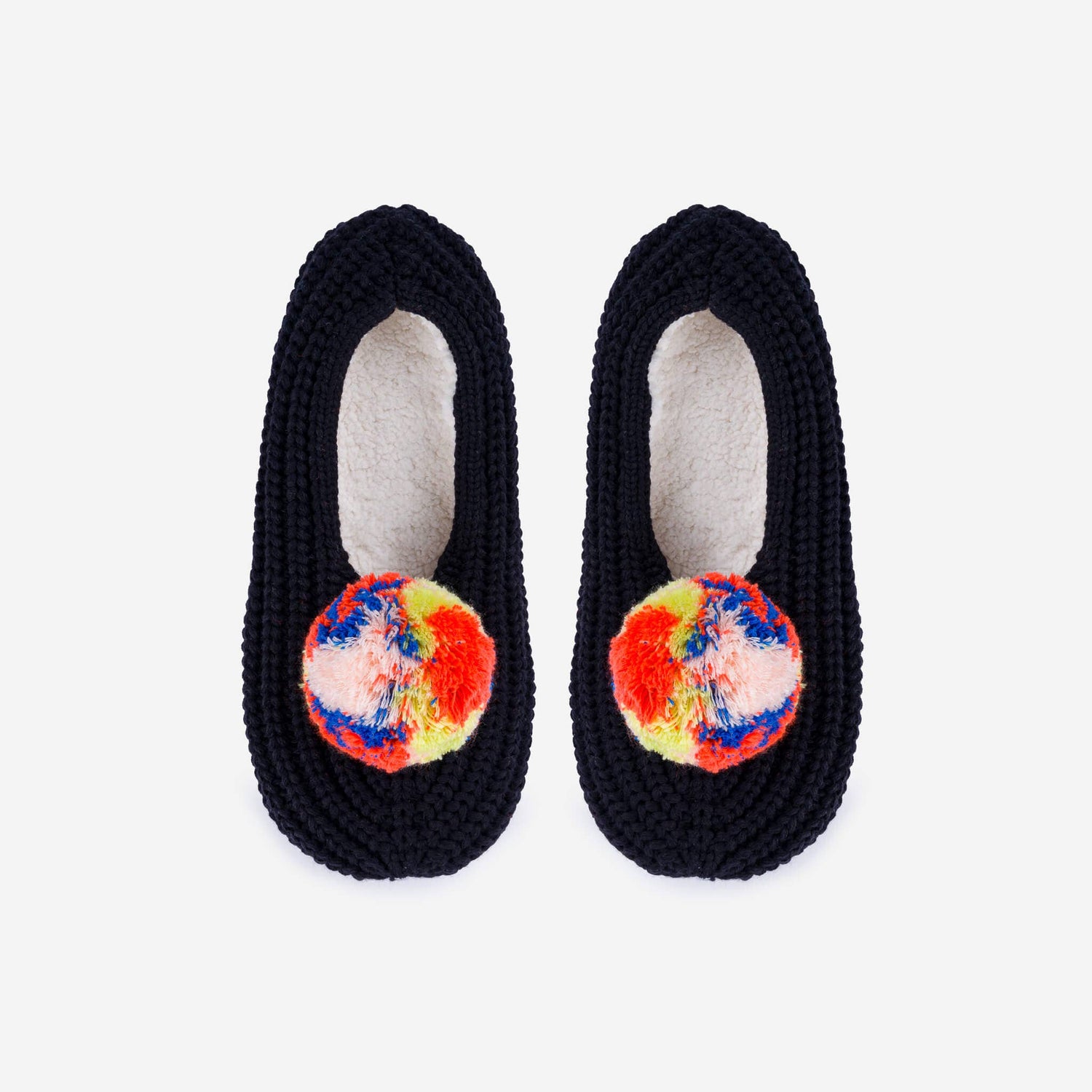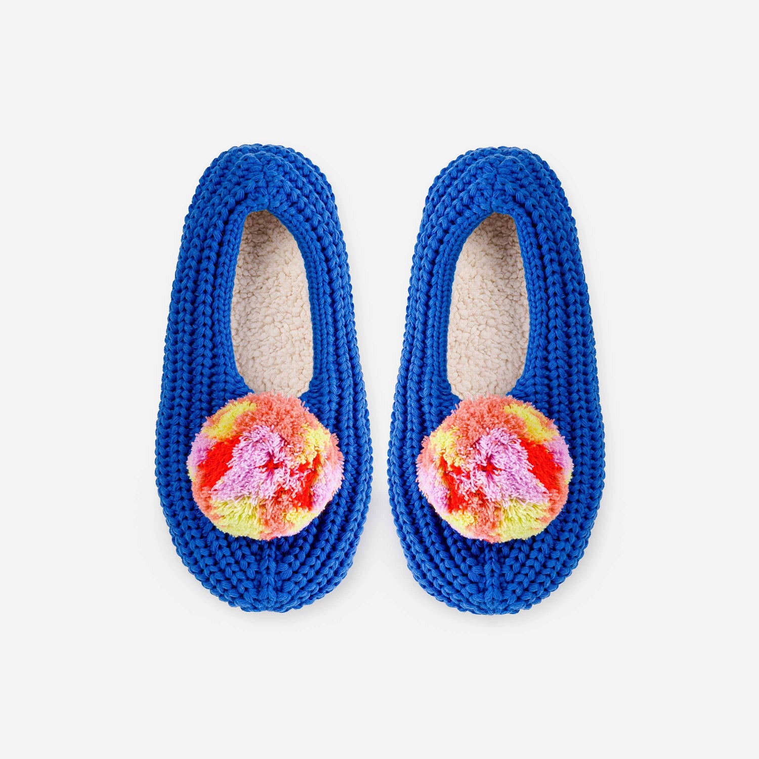Our classic indoor knit slippers topped with a brightly colored 3" pompom. Plush and padded with the softness and cozy fit of your favorite socks. Fleece-lined with a wide toe box, stretchy knit body, and microfiber sole with slip-resistant patches. Made with deadstock yarn. Washable.