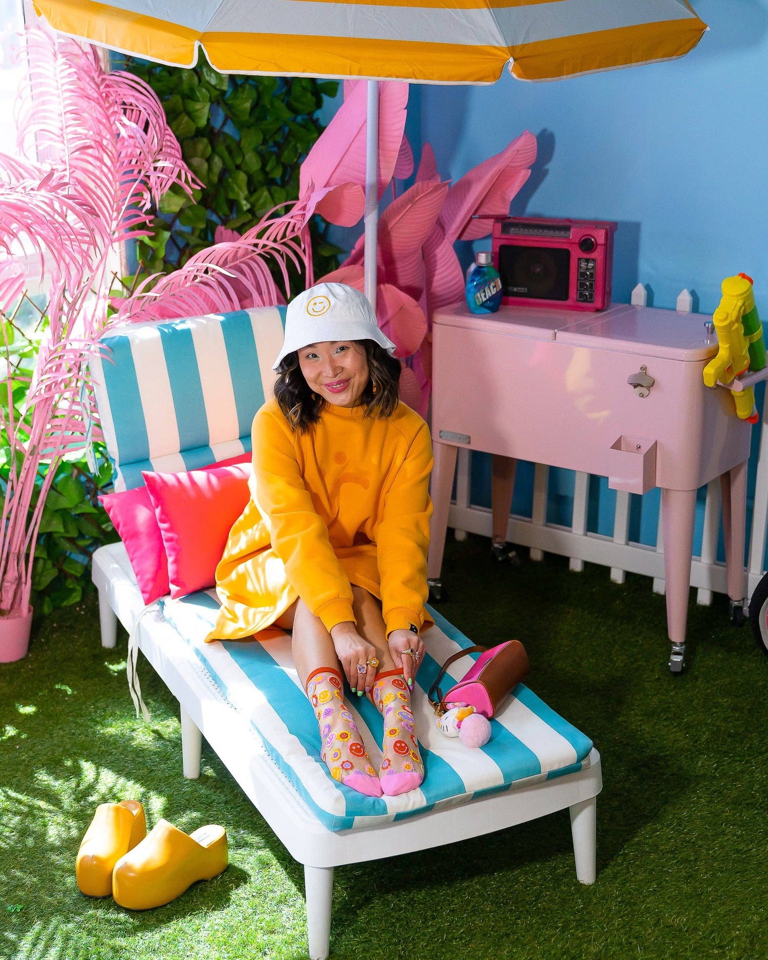Eye-catching smiley faces in pastel colors are guarantee to make your feet happy. We added funky details with daisy petals and heart eyes, making this smiley face sheer sock not your basic fashion sock. Finished with a pink toe and heel for maximum cheerfulness.