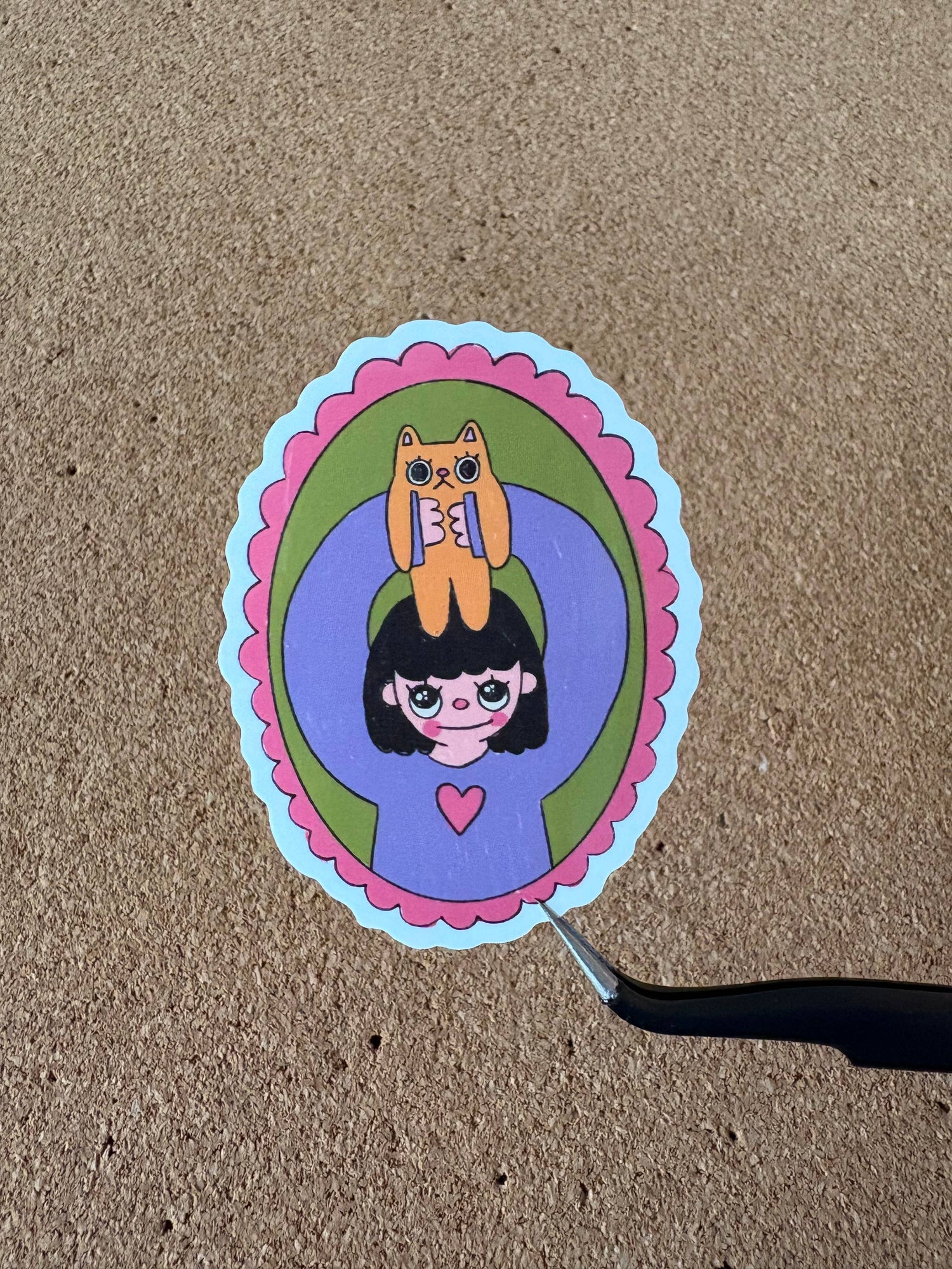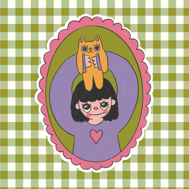 Sticker for the cat lovers who are convinced their cat is the cutest in the world. Featuring a girl holding up her orange cat, surrounded by a cute pink border.