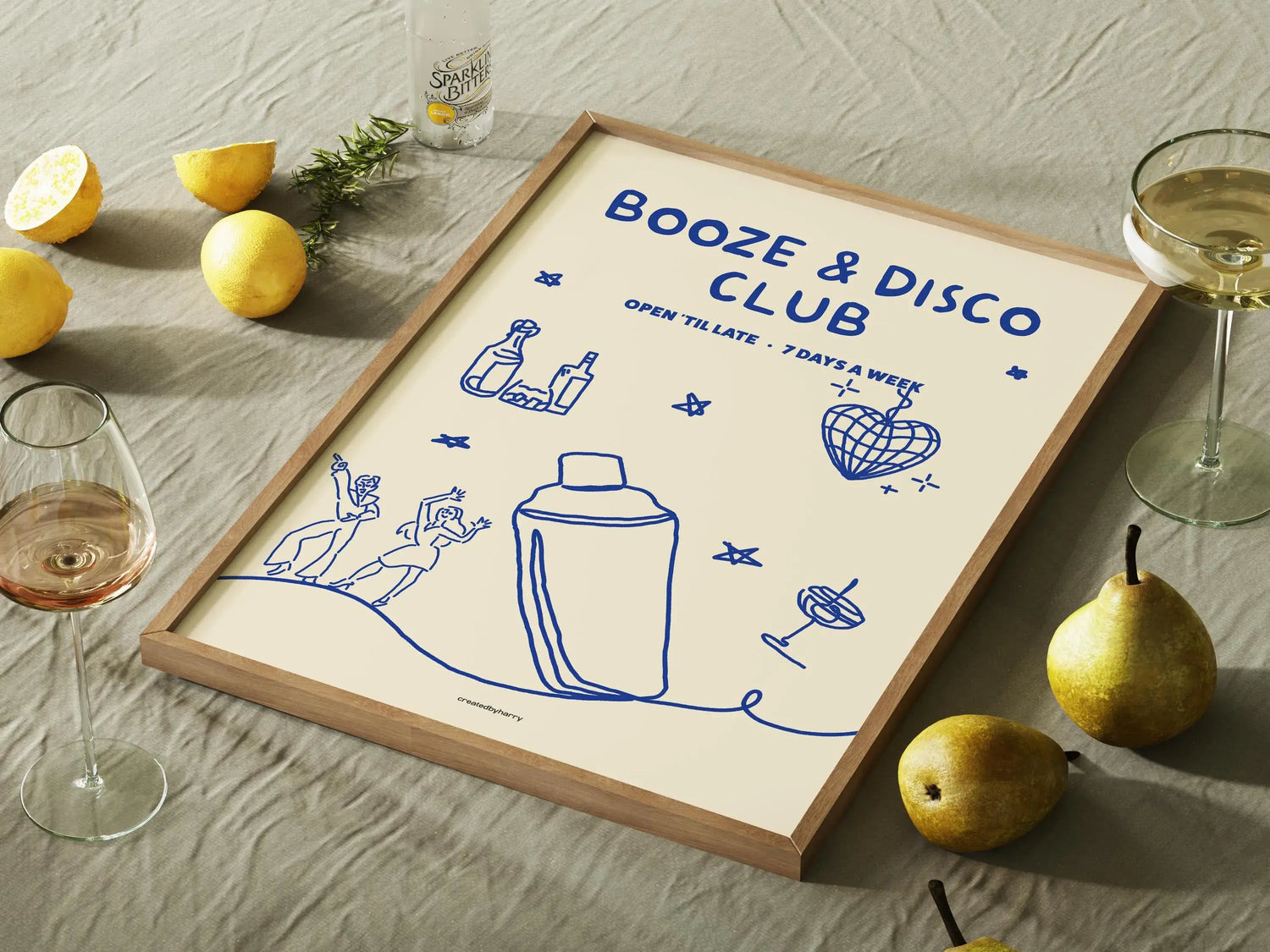 Booze and Disco = the perfect combo!🕺 This beautifully hand illustrated print would be the perfect addition to any living space, hallway or kitchen🤍