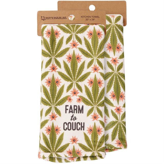 Give anyone that steps into personal space a vibe check with this super-soft cotton kitchen towel displaying a relaxing pot leaf pattern with a chill sentiment that reads "Farm To Couch."