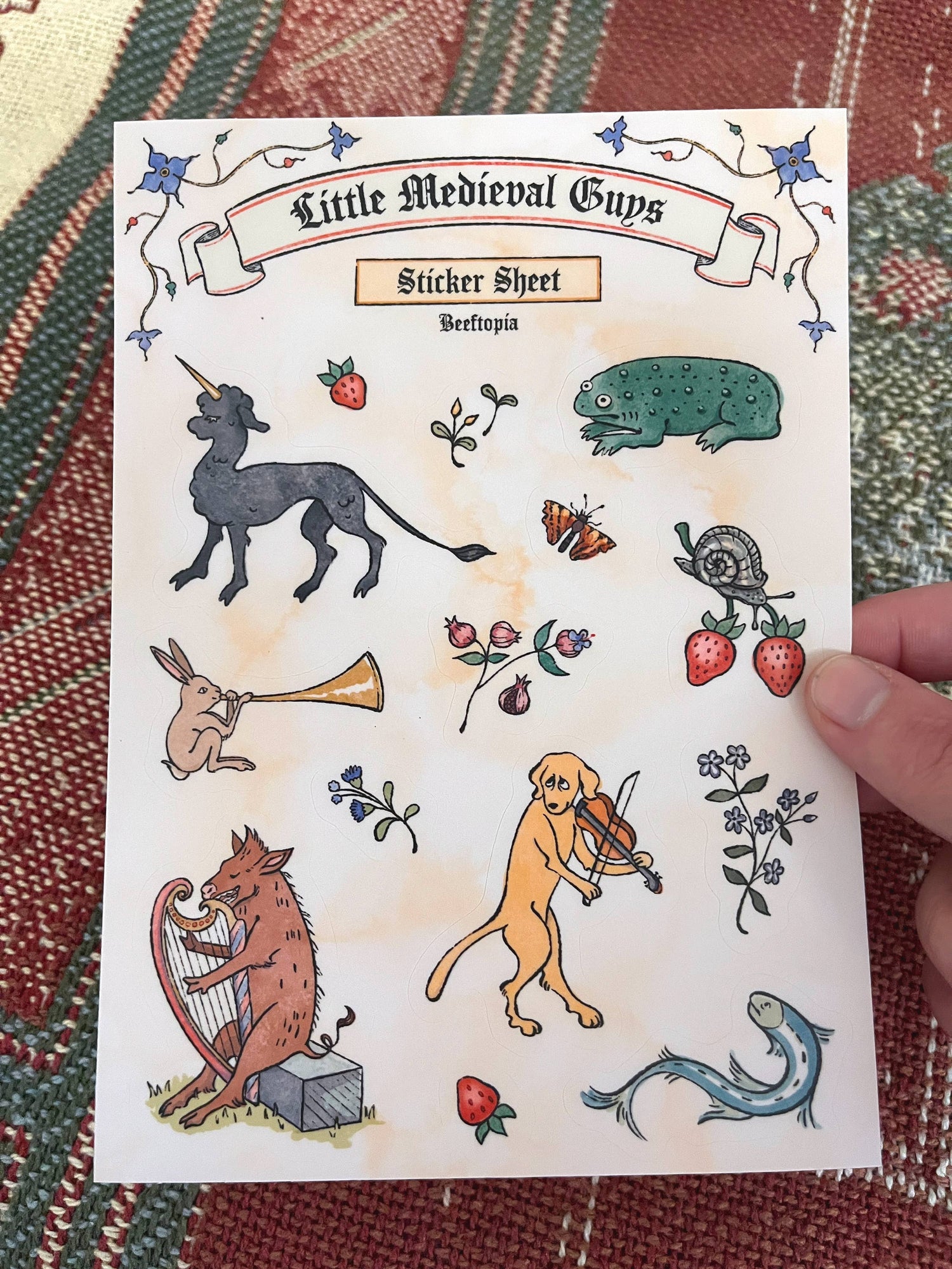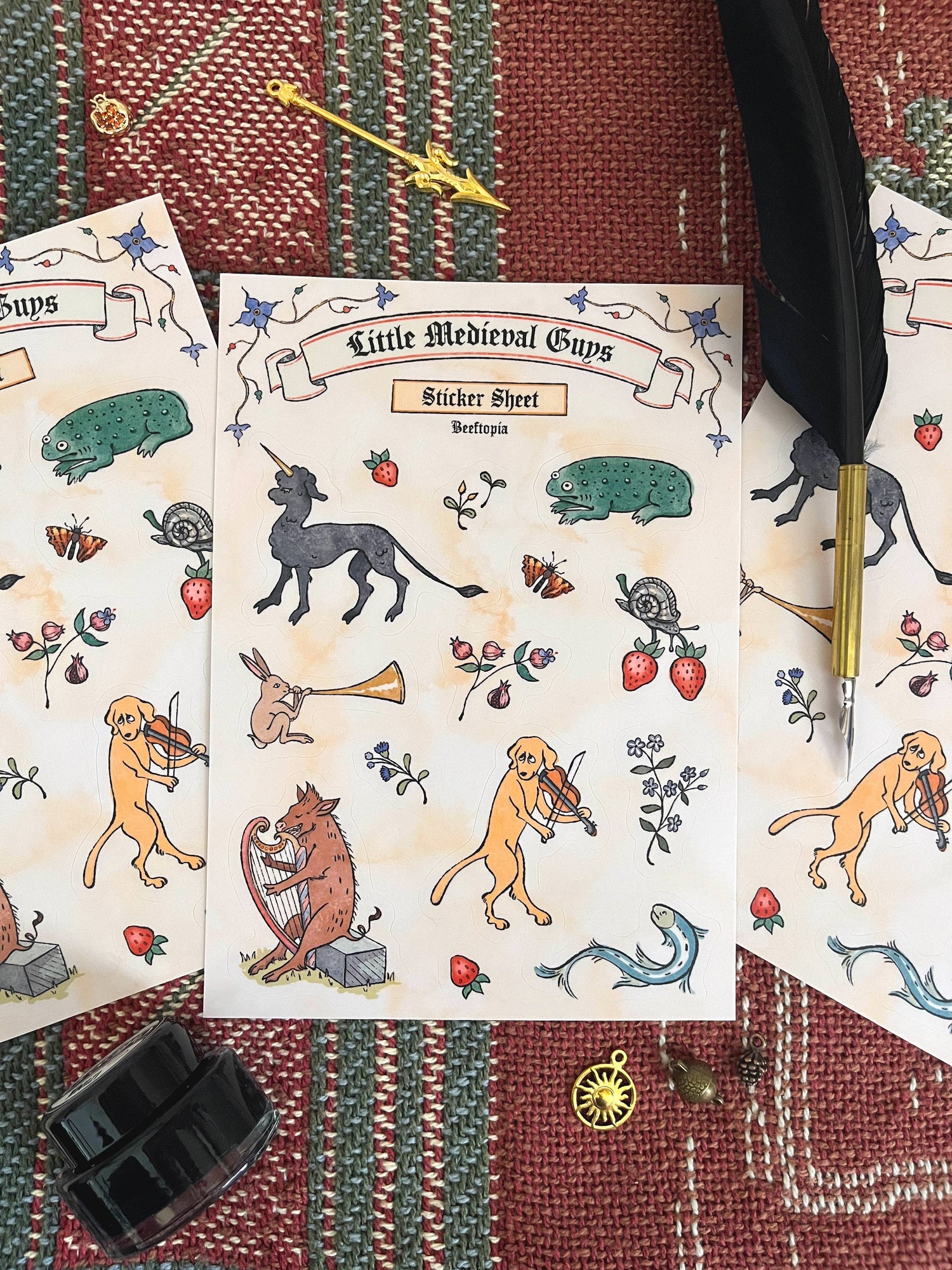 This sticker sheet is inspired by the doodles of silly animals and strange creatures that can be found in the margins of illuminated manuscripts.