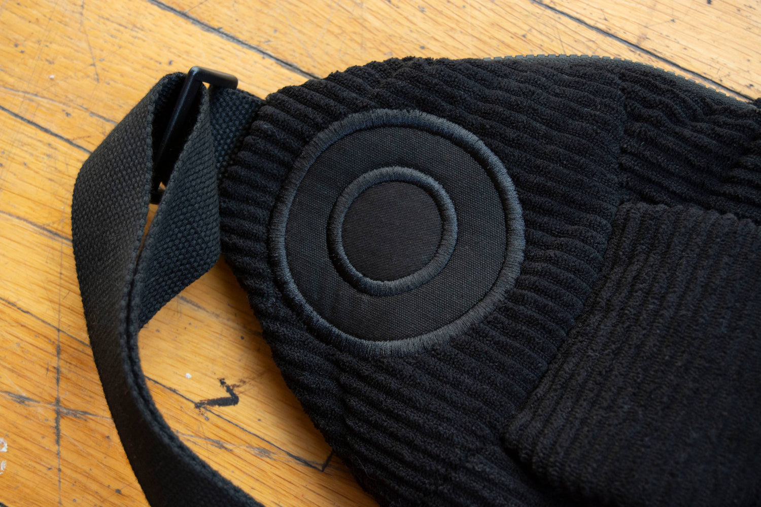 This here Fish Bag is the Goth variety. He's 17" x 6.75" and comes with a fruity little rubber worm zipper pull, D-ring and buckle matched to the adjustable 1.5" wide cotton strap, and can be adjusted to be between ~36" - 80" long (91cm x 203cm) (including the length of the bag) with the included strap-extender. He can be worn as a crossbody or a (large) fanny pack. The interior is lined with a durable cream-colored cotton canvas tastefully flecked with multicolored 'funfetti sprinkles'. The large main pocket extends the entire length of the fish and is big enough for a standard sized water bottle, Nintendo Switch, or small journal. A smaller interior pocket is great for your wallet, phone, or your pencils and pens.