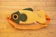 This here Fish Bag is the Fruity variety. He's 17" x 6.75" and comes with a fruity little rubber worm zipper pull, D-ring and buckle matched to the adjustable 1.5" wide cotton strap, and can be adjusted to be between ~36" - 80" long (91cm x 203cm) (including the length of the bag) with the included strap-extender. He can be worn as a crossbody or a (large) fanny pack.