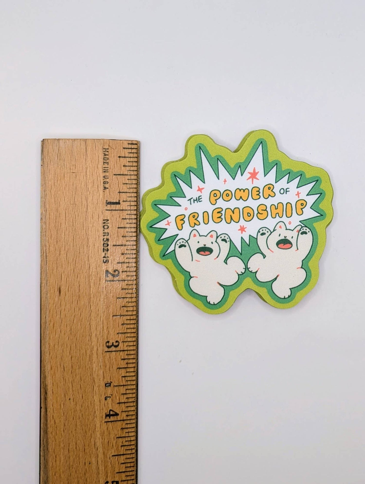 Celebrate the magic of companionship with The Power of Friendship Cats sticker! This adorable vinyl sticker features two energetic cats mid-leap, surrounded by a dynamic starburst and the uplifting phrase "The Power of Friendship."