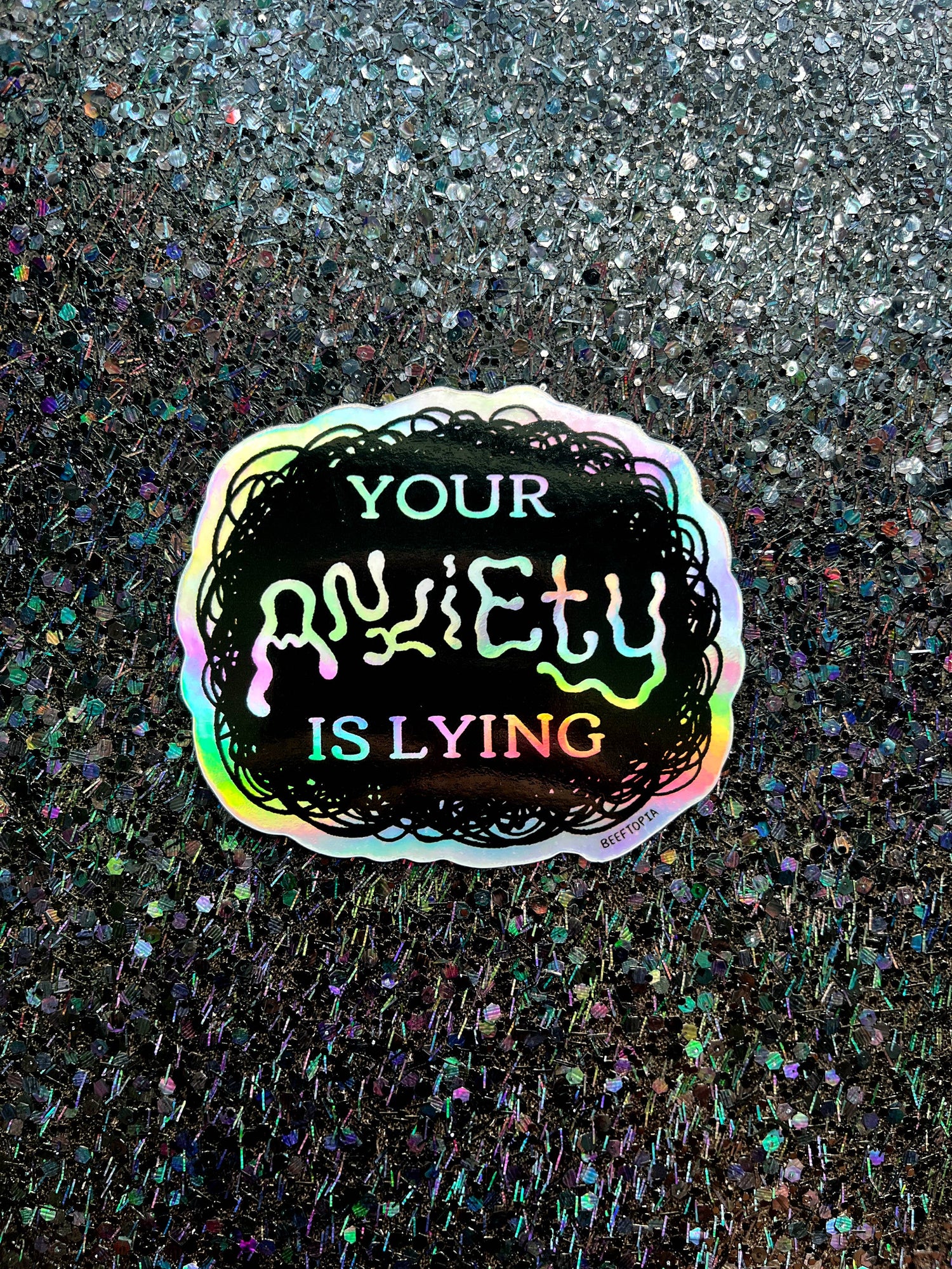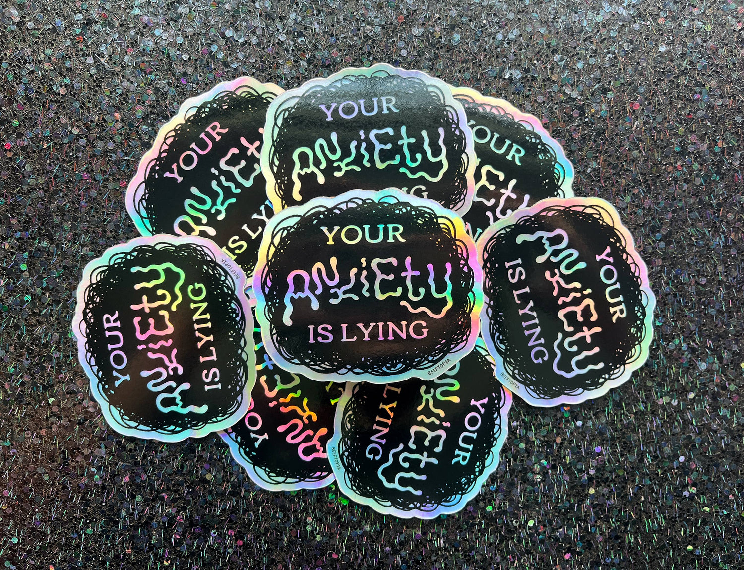 Your Anxiety is Lying Holographic Sticker is backordered and will ship as soon as it is back in stock.